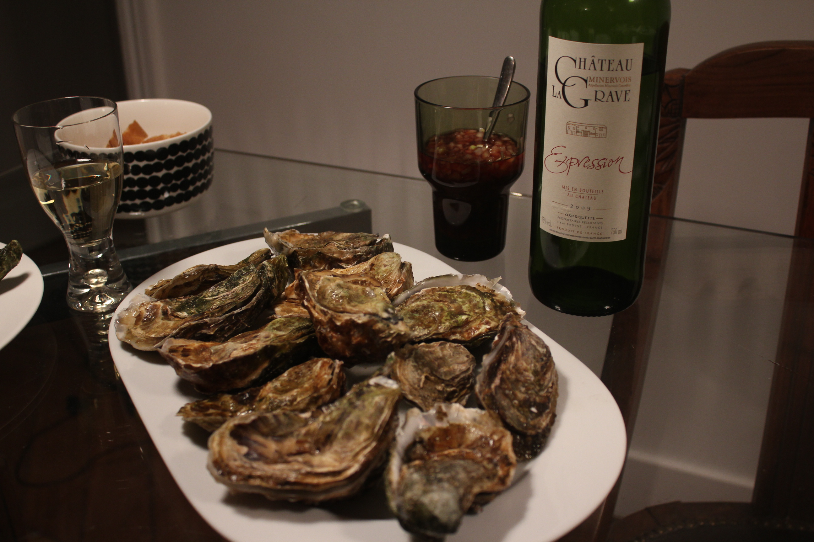 Our local caviste in the 15th arrondissement had suggested an excellent bottle of white wine to go with the oysters: Chateau la Grave ‘Expression’ Minervois 2009 (http://www.chateau-la-grave.net/wines/expression-blanc.html). For the cheese, we had bought Buzet Les Prieurs de Fonclaire 2010 (http://www.nouvelle-epicerie.fr/fr/sud-ouest-provence/5201-buzet-les-pieurs-de-fonclaire-2010-rouge.html). Both bottles cost less than 10€ and far exceeded our expectations.