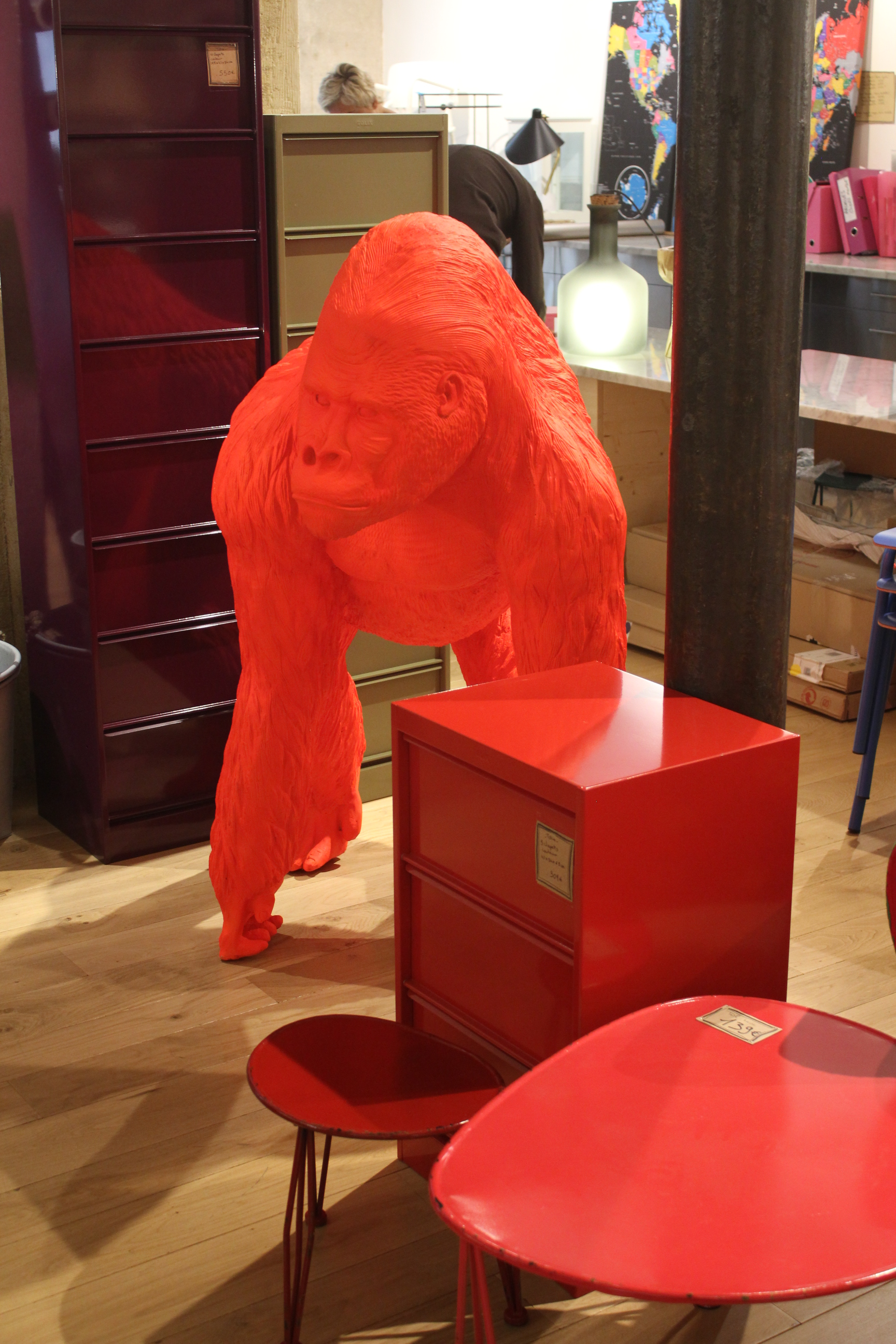 SHELVES & BUREAU FURNITURE: These shelves on the right are hugely popular, photographed by many decoration magazines. Unfortunately the size is not ideal for our kitchen, so I think we will keep looking… or maybe I will return to have a third look!shelvesIf we had more space or needed more furniture, I would probably buy this bureau furniture for papers and folders. I think the greenish color on the right is very subtle (photo below).more colors! Lastly, the next time you need to buy a gift for a a friend who has “everything” (and who also possesses an apartment with a lot of space!) why not to buy this gorilla? King Kong is back!Red King Kong