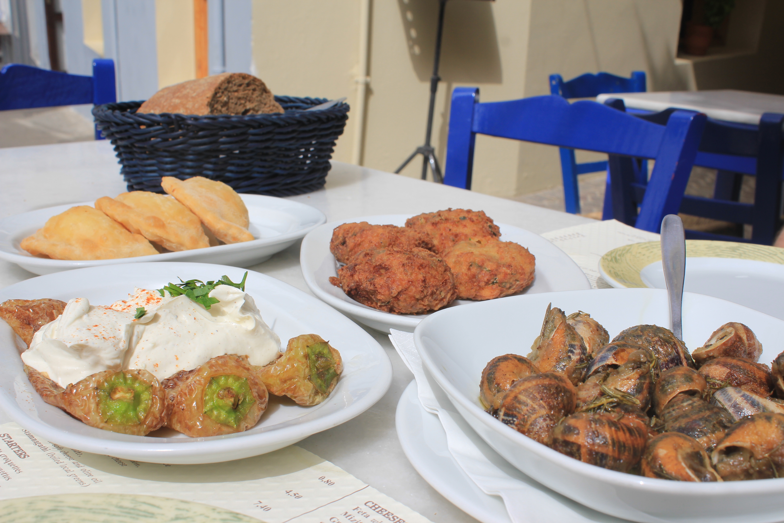 Snails have special health benefit so our first lunch consisted of rosemary snails, aubergine croquettes, fried peppers with yogurt-garlic sauce and Cretan pies with local white cheese.