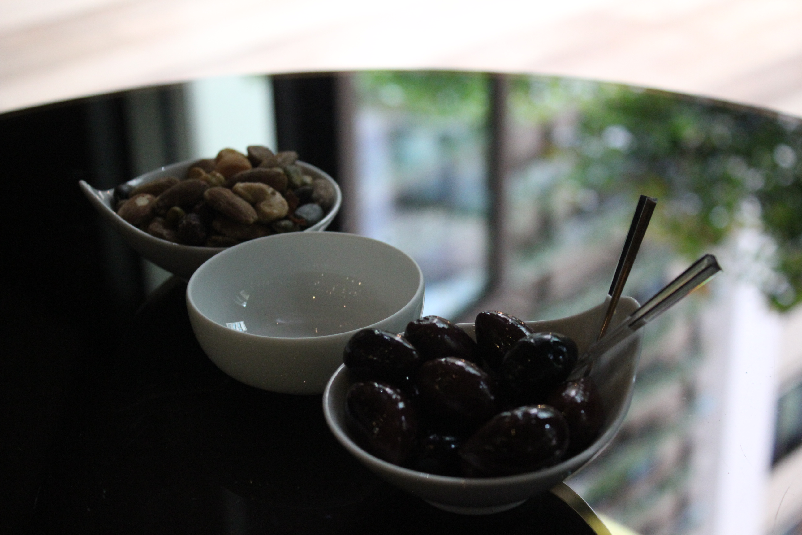 We ordered a glass of rosé wine called AOC Côtes de provence Alycastre «Domaine la Courtade» 2011 and a glass of champagne, Ruinart Blanc de Blancs. We were immediately offered a lovely, truffle-flavored nut mix with giant black olives. When the drinks arrived, we noticed