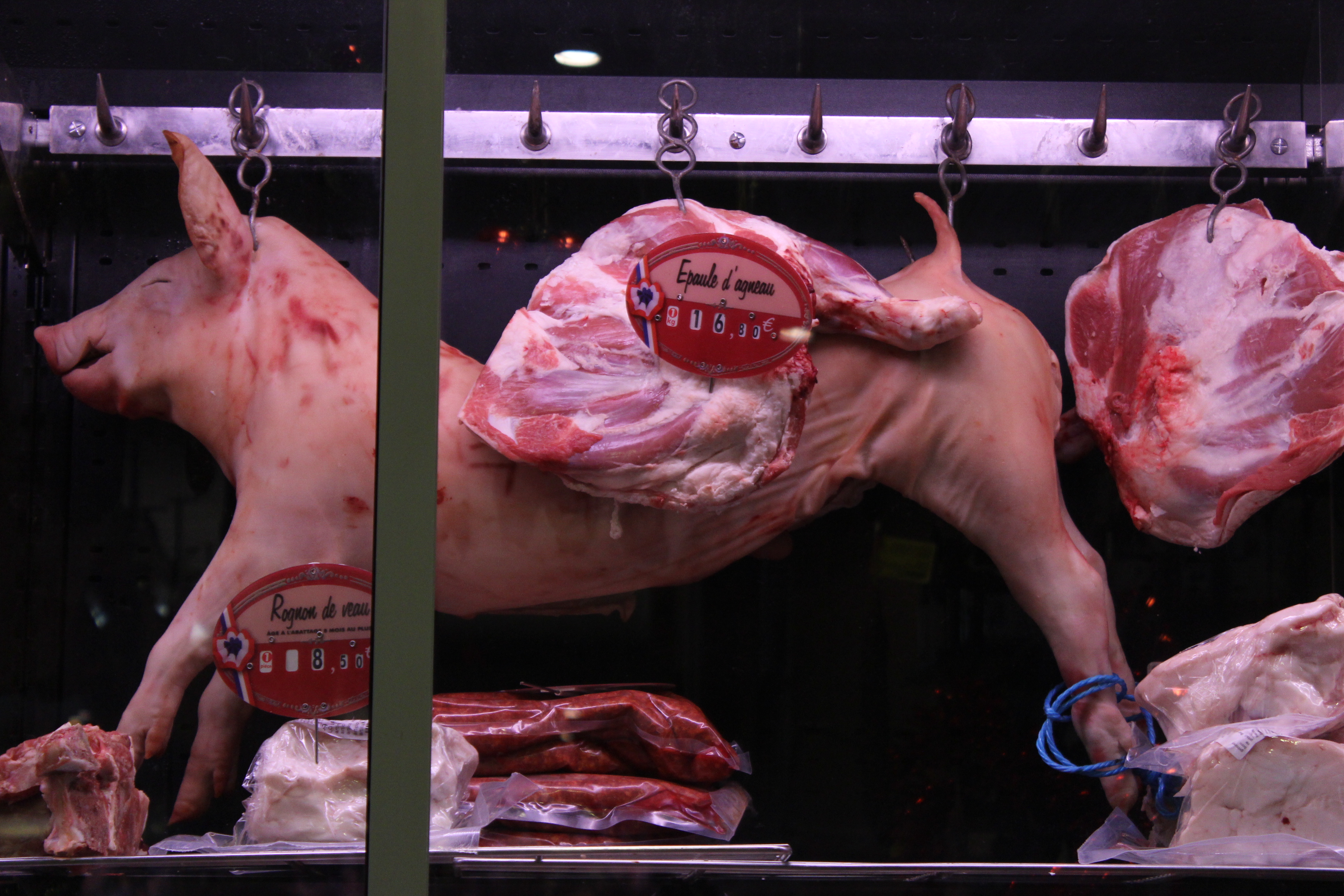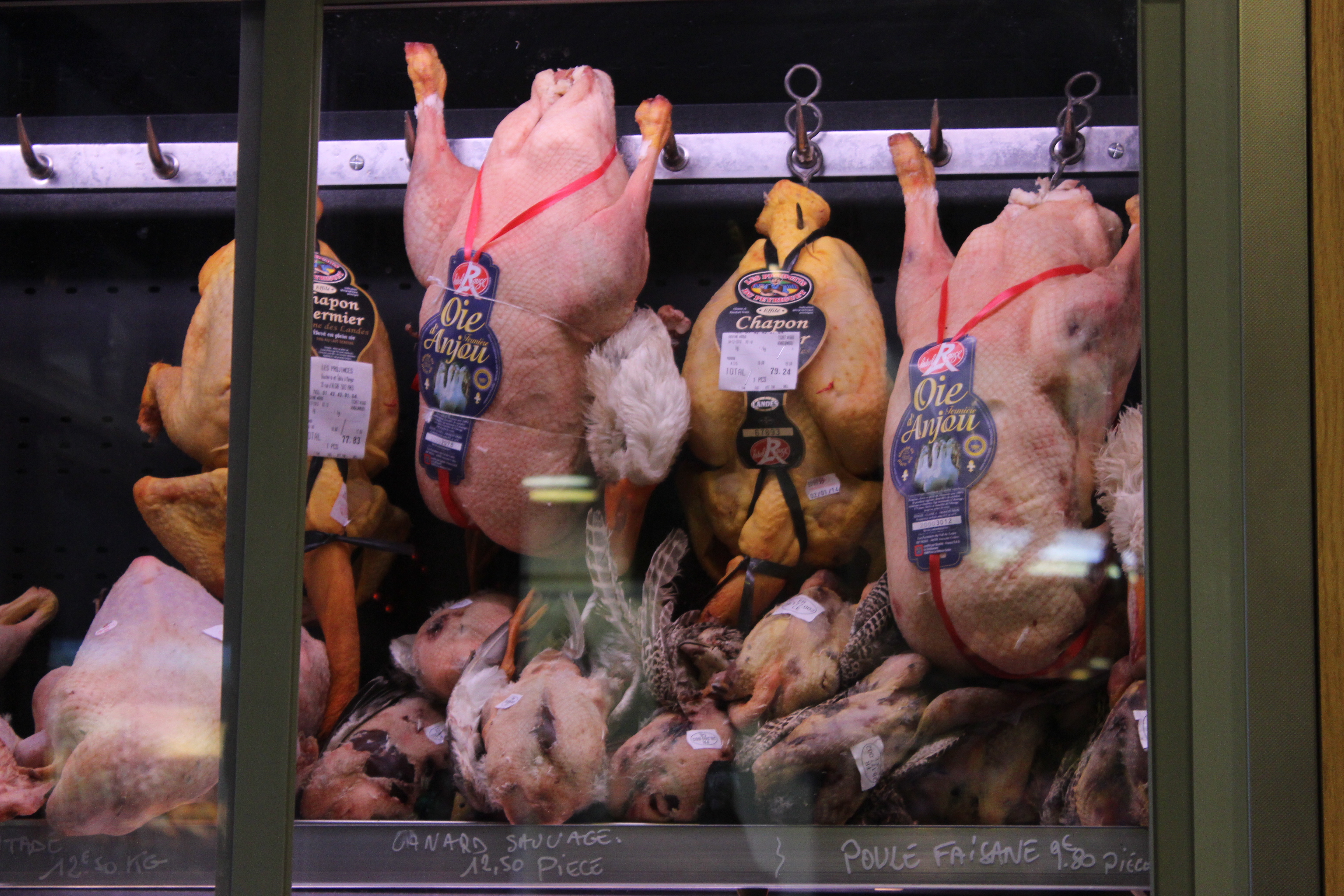 One week before Christmas we visited the boucherie-restaurant Les Provinces near Marché d’Aligre to see what our options for the Christmas meal are. The most typical French Christmas meat (poultry) is capon, a castrated rooster, but the butcher suggested we buy goose. After discussing the choice between the capon and the goose with everyone, we agreed that we prefer goose. Price-wise there was no difference and we had a feeling that the goose will be more original –the goose meat is more reddish brown (similar to duck or duckling) whereas the capon remains white as chicken (but is more fatty). So, “Prepare us a nice big goose with stuffing” we told the butcher and left a 10€ prepayment!