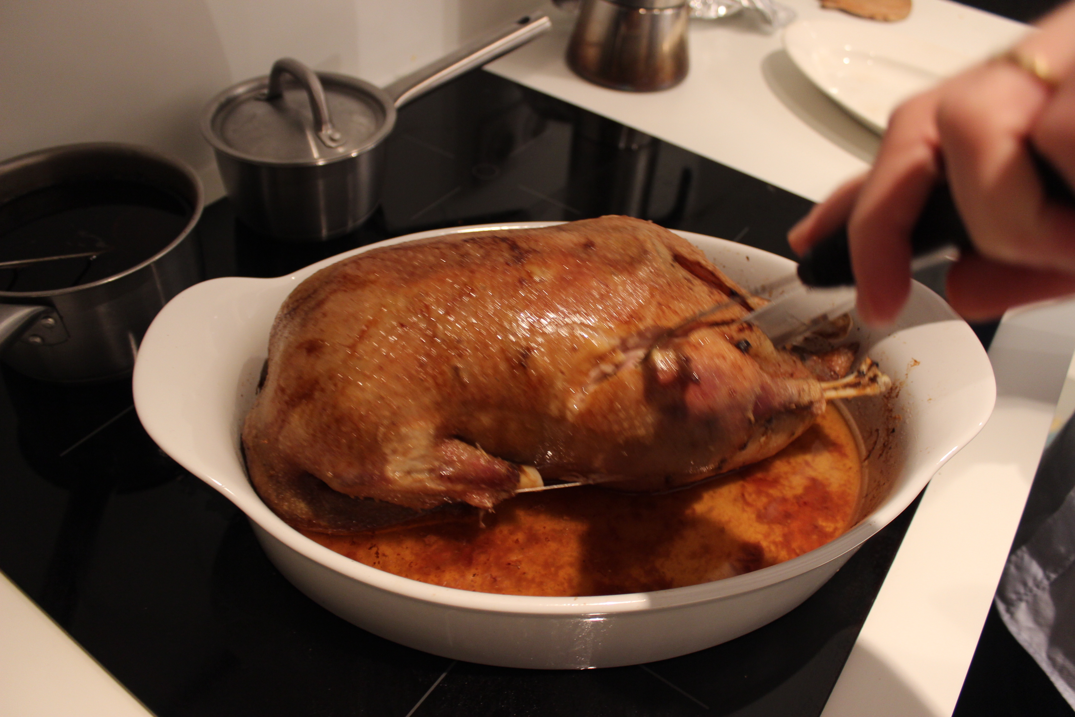 We followed the roasting instructions: higher temperature in the beginning that gives the goose golden color and crispy texture, and lower temperature during the rest of the time with the aluminium foil. We added a glass of water in the casserole and kept moistening the goose with this water (some fat drained from the goose and mixed with the water). 2 1/2 hours later our goose left the oven and was ready to be cut. Such a beautiful piece of goose it was!